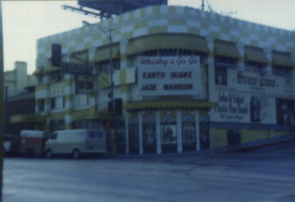 The front facade of the Whisky a Go Go in Los Angeles, during Jade Warrior's American tour in the summer of 1972. The photo was apparently taken during the latter part of the band's gig at the Whisky, since the two band names on the marquee are in the same size type.